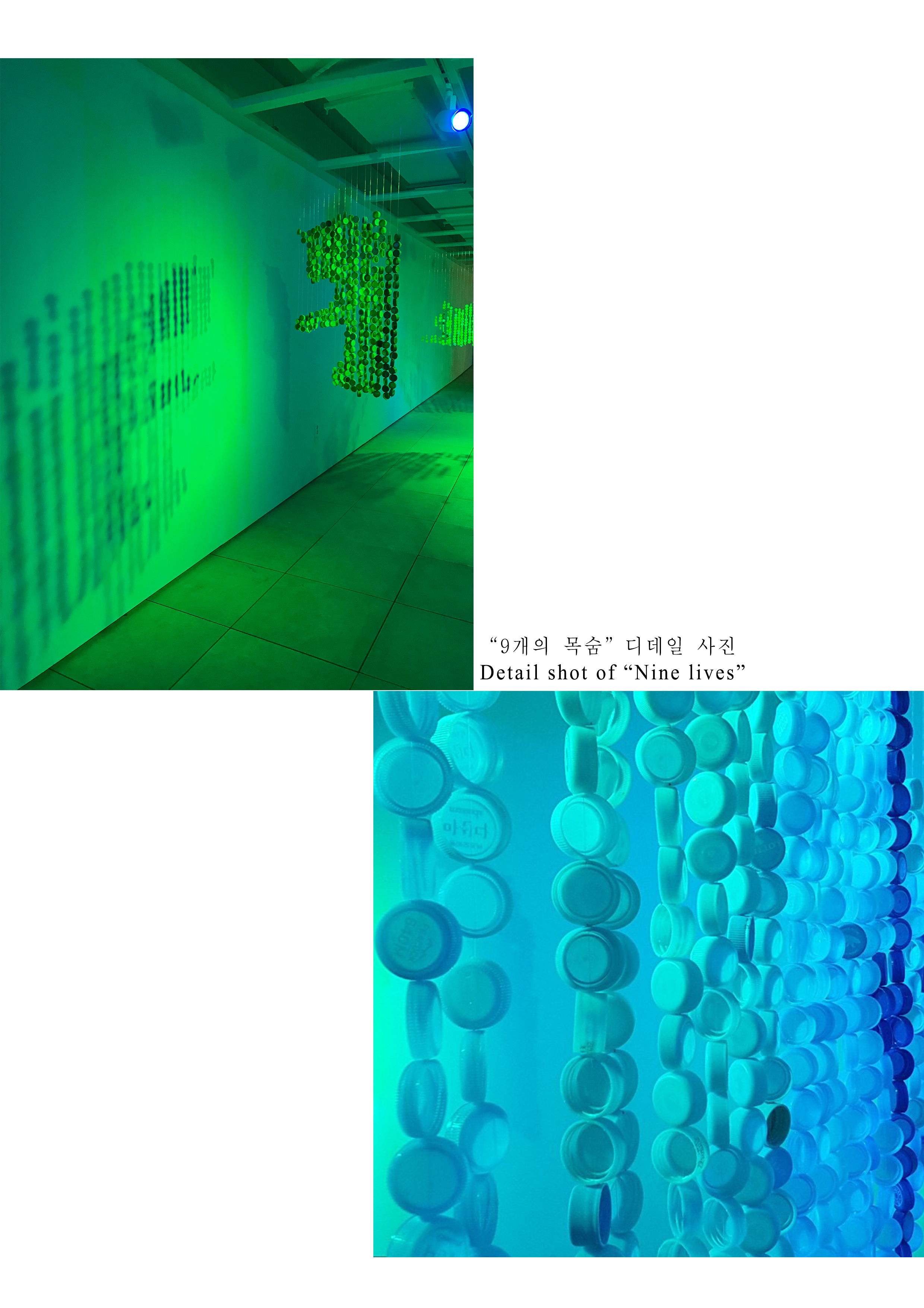 사람들은 고양이를 빗대어 9개의 목숨을 가졌다고 한다. 길고양이를 주제로 한 본 작업은 병뚜껑으로 9개의 고양이 그림자 실루엣을 만들었다. 고양이는 적록색 맹으로 녹색, 파란색, 노란색 계열은 구분이 가능하나 붉은색 계열은 전혀 구분하지 못한다. 녹색과 파란색 병뚜껑으로만 작업을 하고 조명 또한 녹색과 파랑만 사용하여 고양이들이 보는 세상을 상상해 보고자 했다.