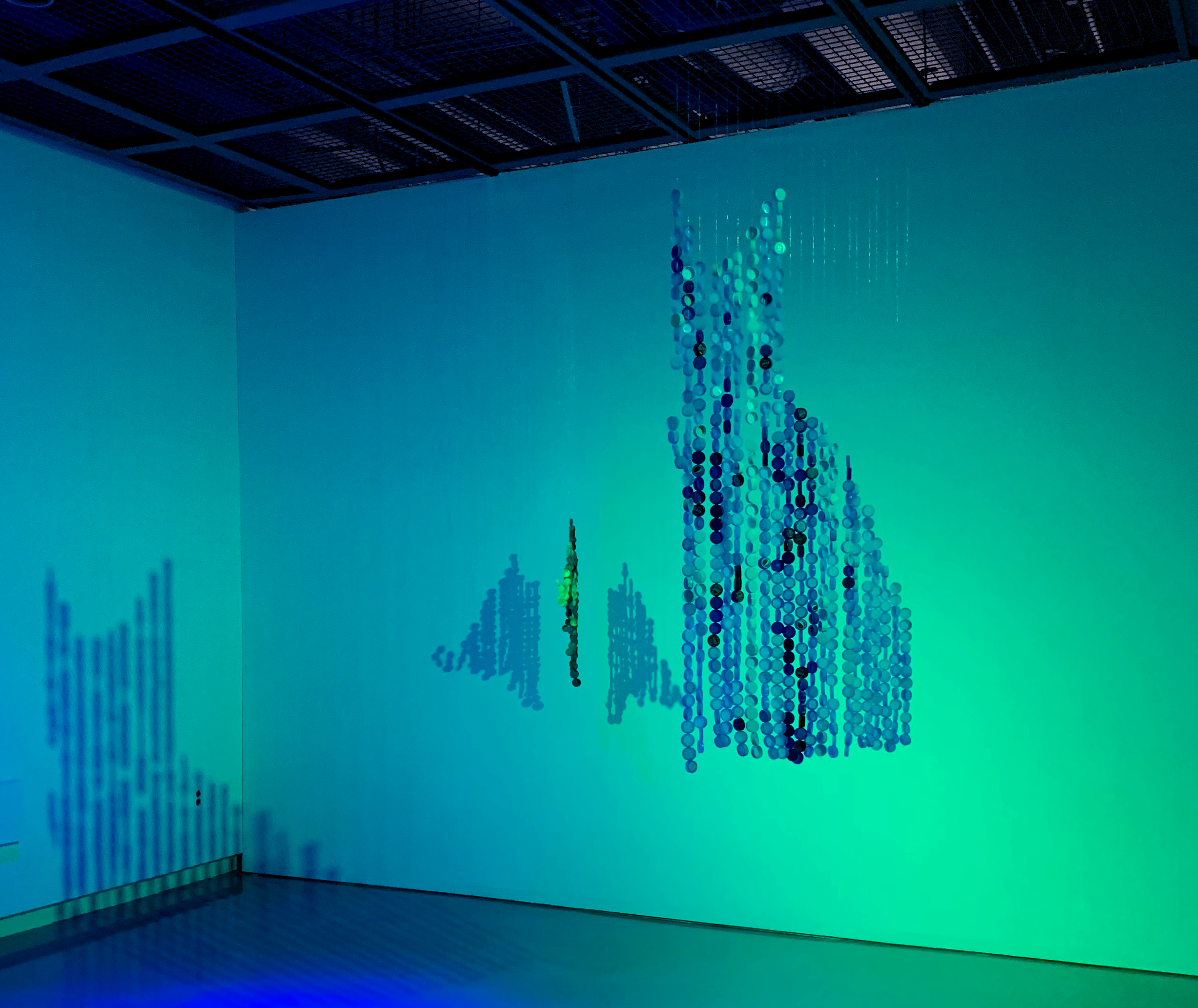For this reason, the work is made exclusively with green and blue bottle caps, and the lighting is also limited to green and blue tones. Through this restricted palette, I sought to imagine and visualize the world as seen through the eyes of cats.