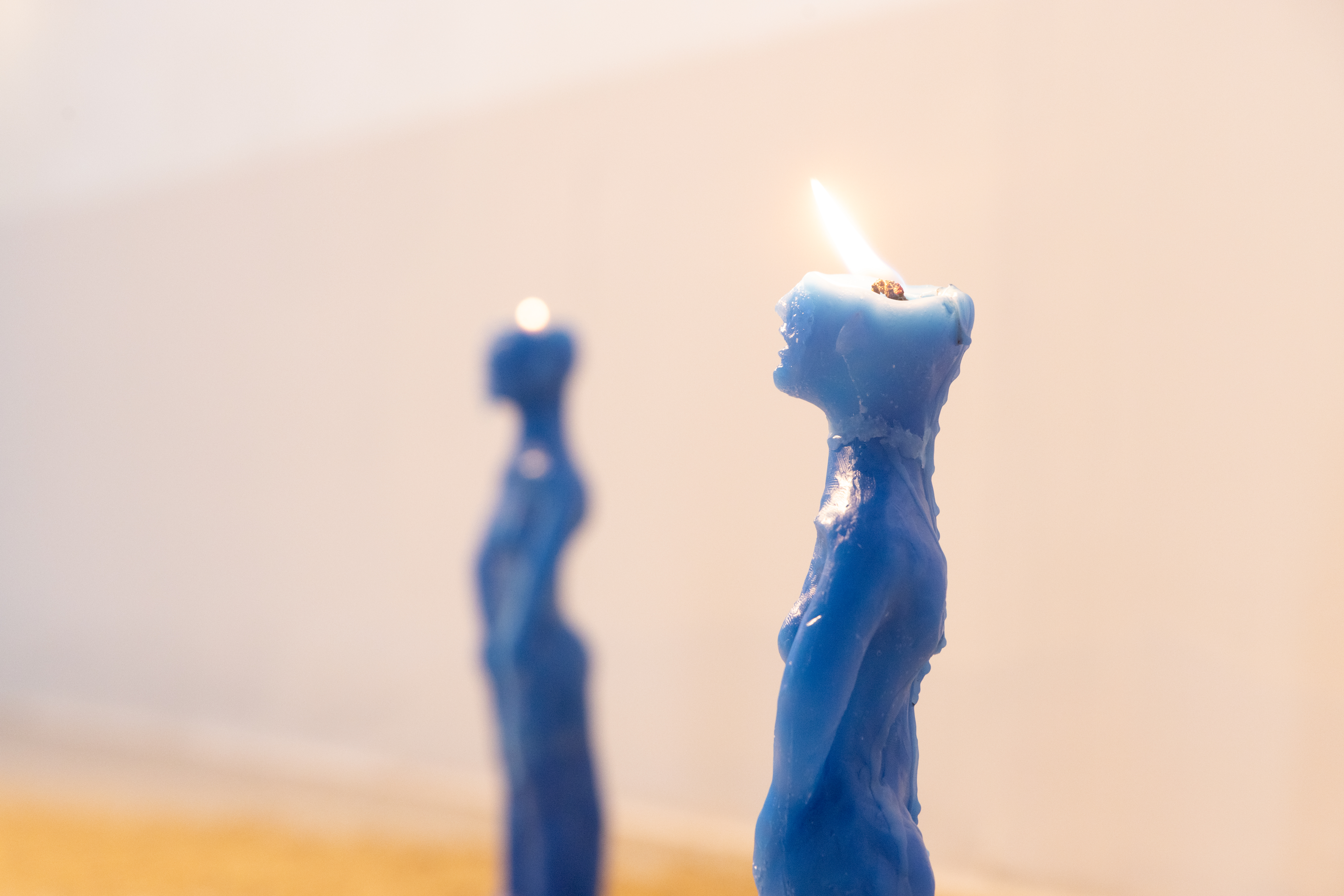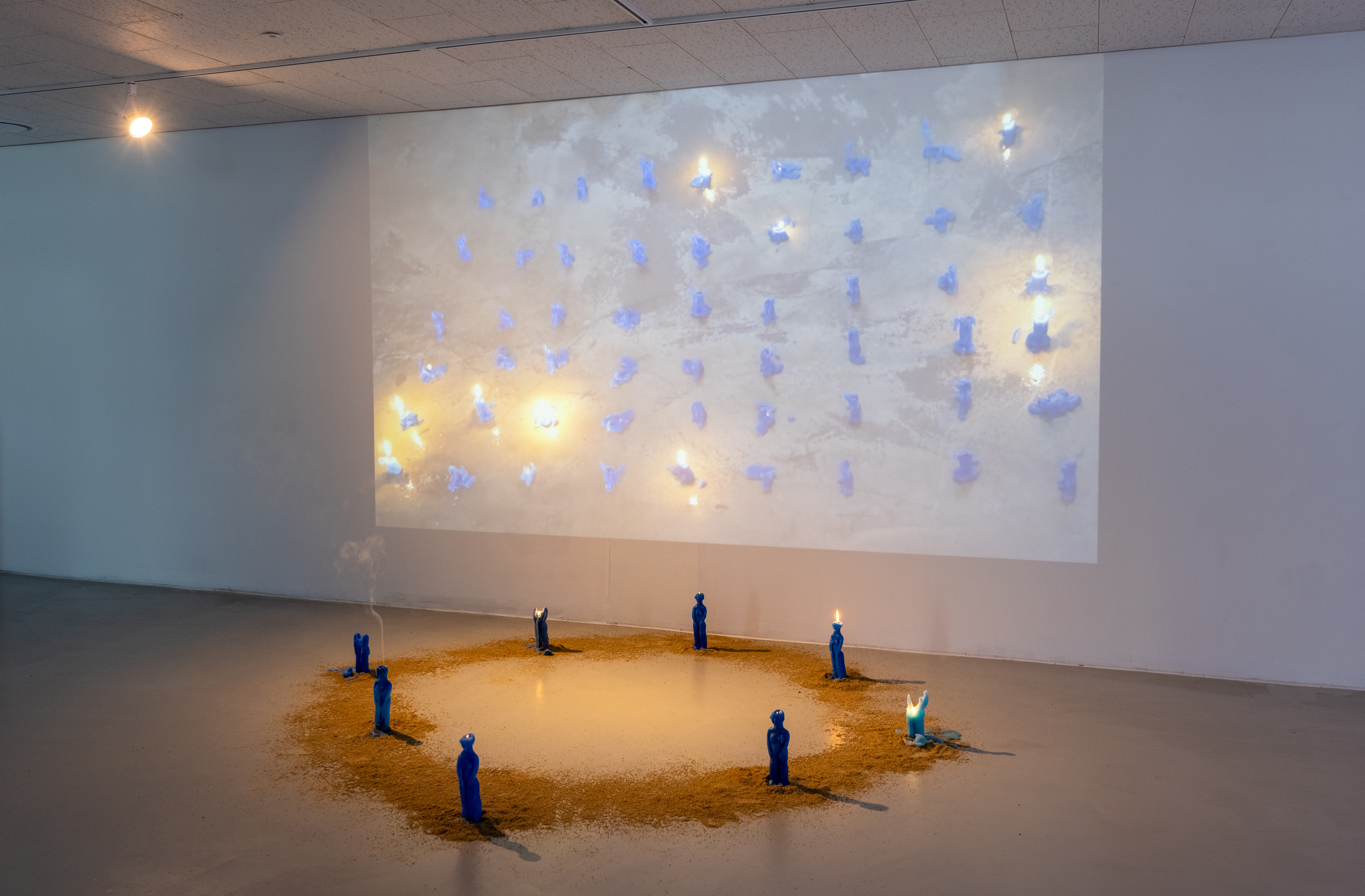 "Divine Mother" began with fifty-four blue, human-shaped candles. When the work was initiated in 2015, this number corresponded to the living survivors of a specific generation of mothers. The blue candle is associated with meanings such as wisdom, harmony, inner light, peace, truth, and guidance; it is also linked to healing, sleep, intuition, dreams, and for some, the presence of the Divine Mother itself.